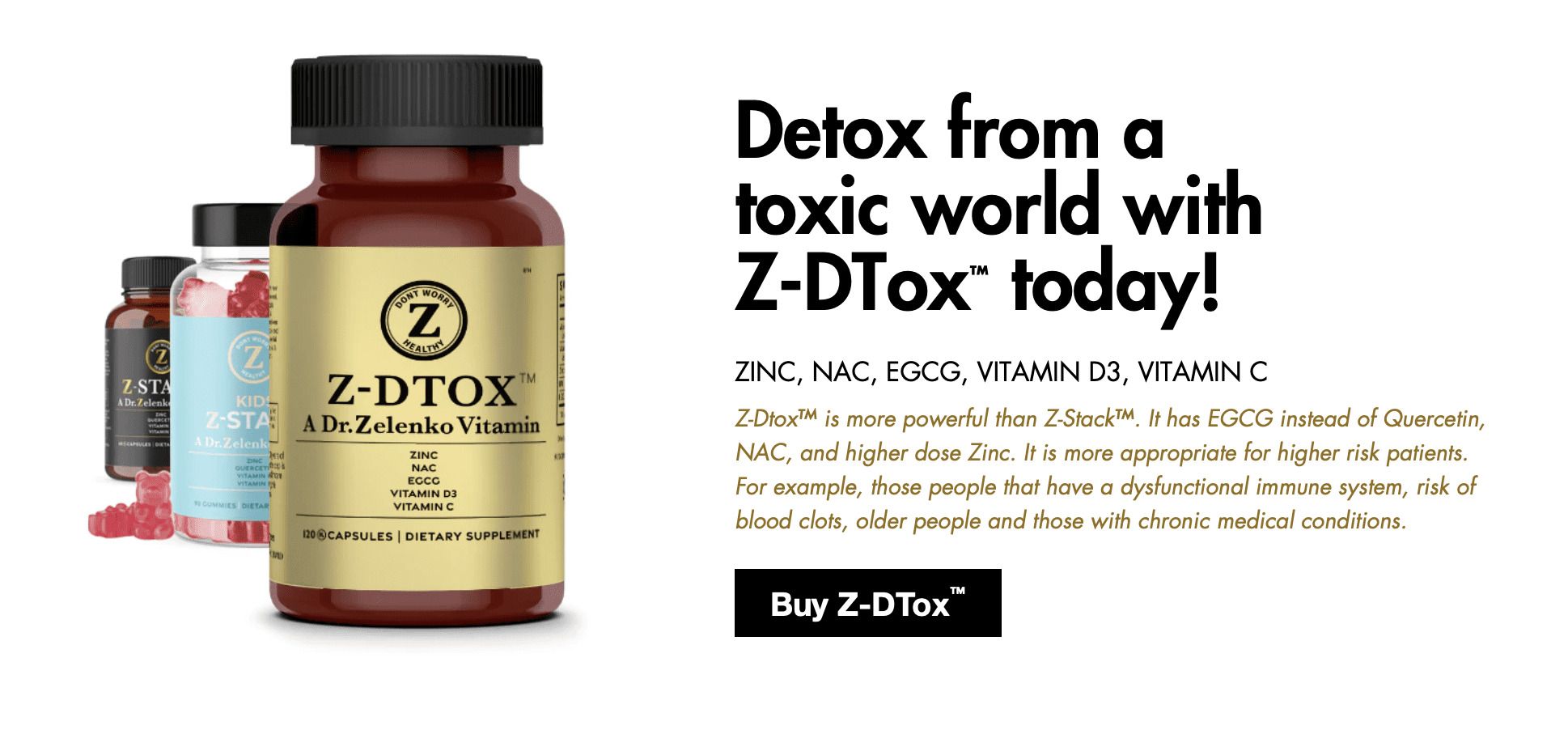 Z-Dtox is Dr. Zelenko’s proprietary combination of EGCG, NAC, Zinc, Vitamin C and Vitamin D.
